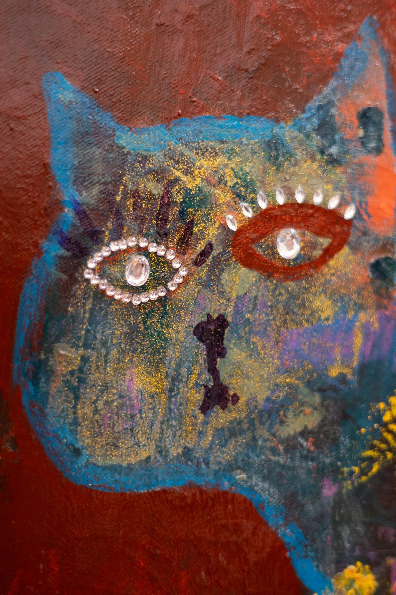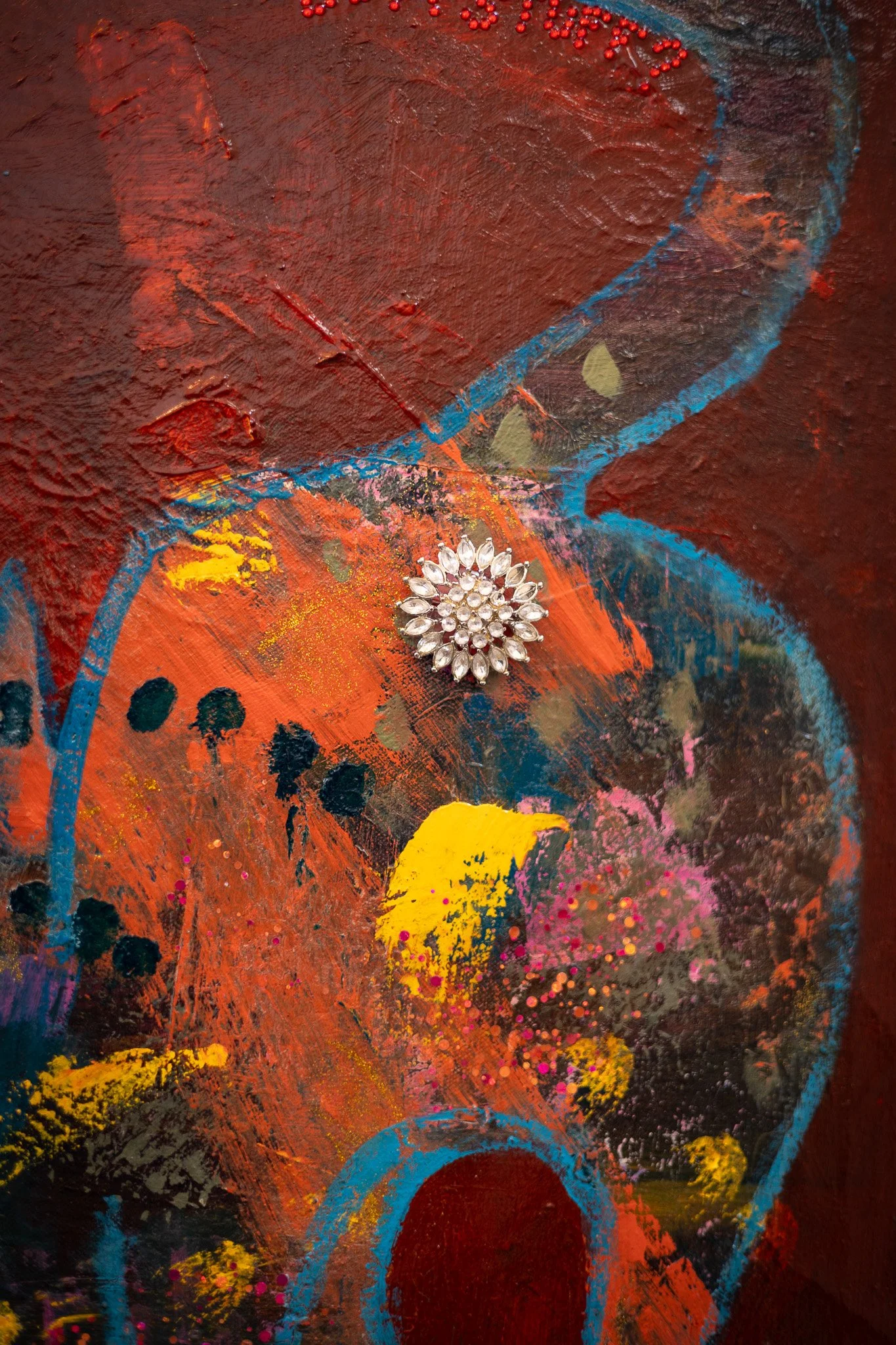 Acrylic paint, rhinestones, glitter, a vintage brooch, and acrylic resin on vintage canvas, framed in gilded and lacquered wood.