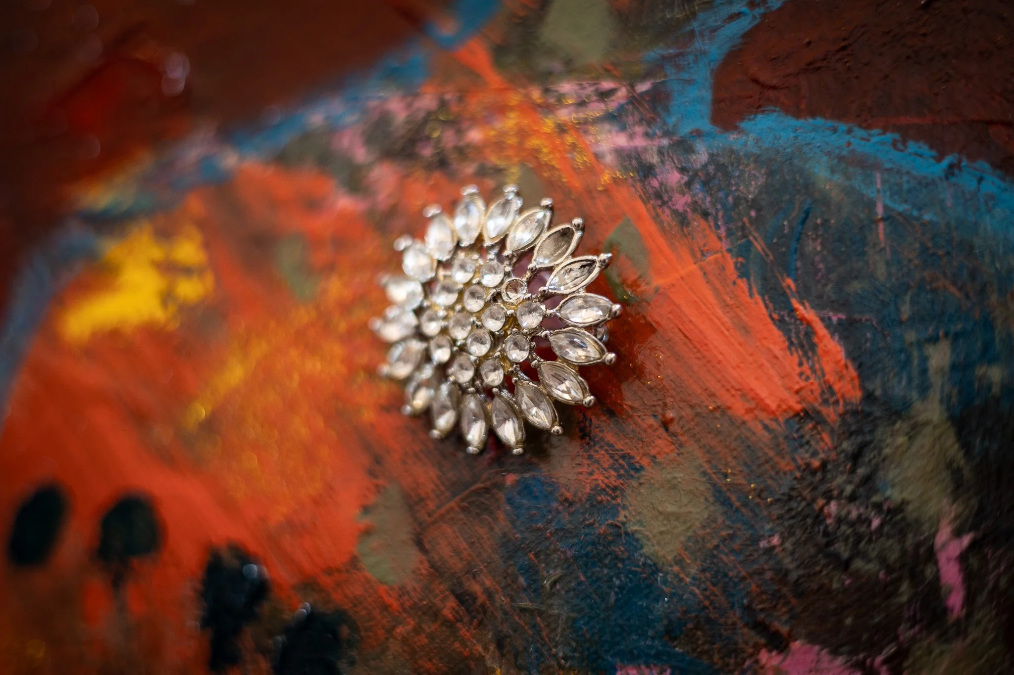 At first glance you’ll probably miss the wording on this piece, and then a twinkle from under the tail of the cat might catch your eye. You lean closer, your nose almost touching the vintage brooch adorning the centre of the canvas, and then all of a sudden the light catches the rhinestones and the red-on-red letters sparkle into view: