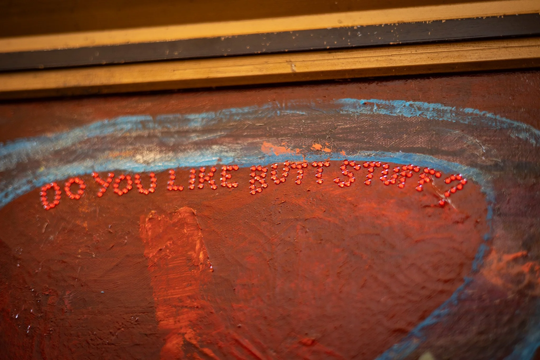 Similarly to The Void, I wanted the lettering to be quite obscure, coercing you into an uncomfortably close relationship with the piece, and mimicking the way this question forces an intimacy that hasn’t been earned or invited. In this instance the tiny lettering is made of red rhinestones on a red background, only truly visible if the light catches it the right way.