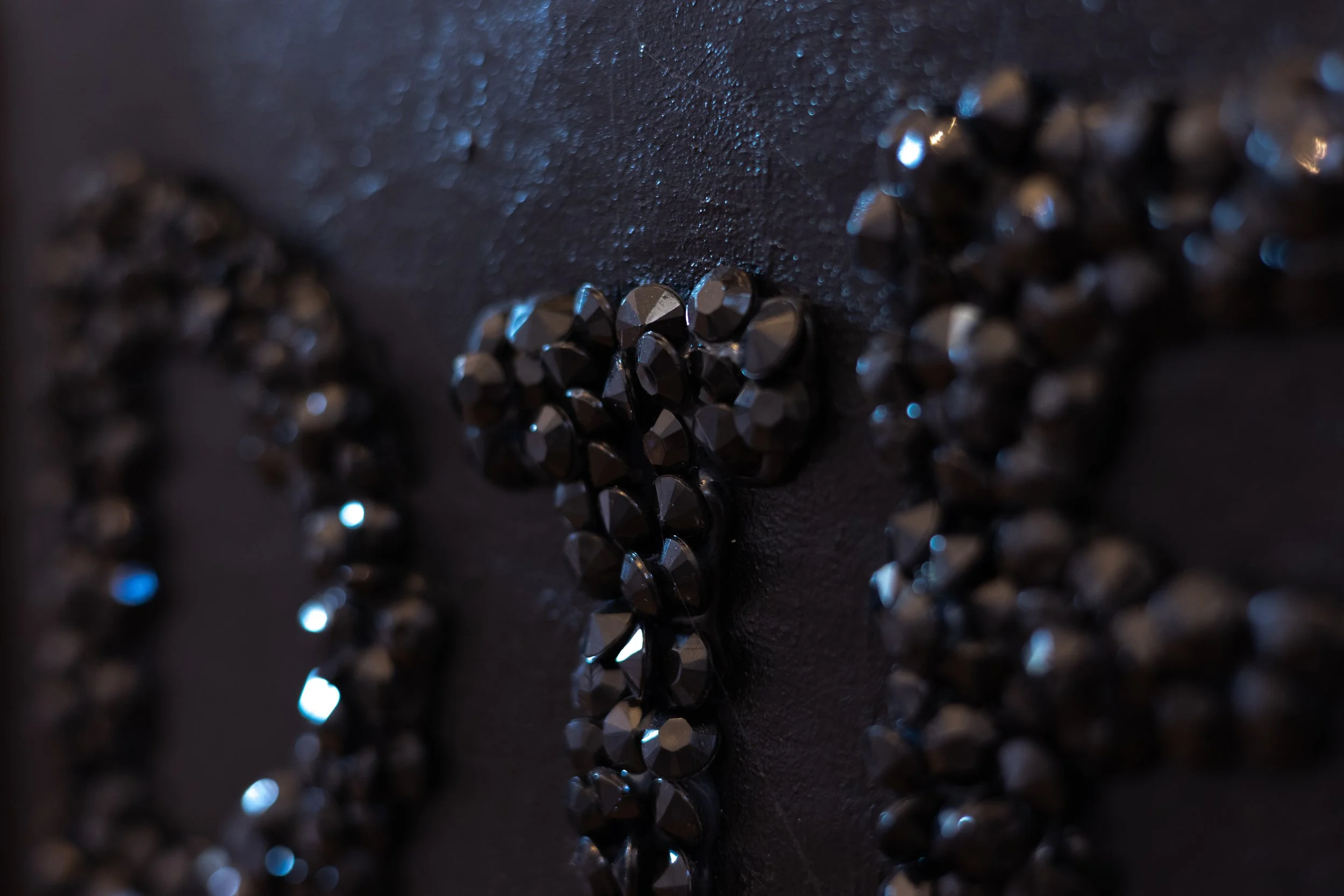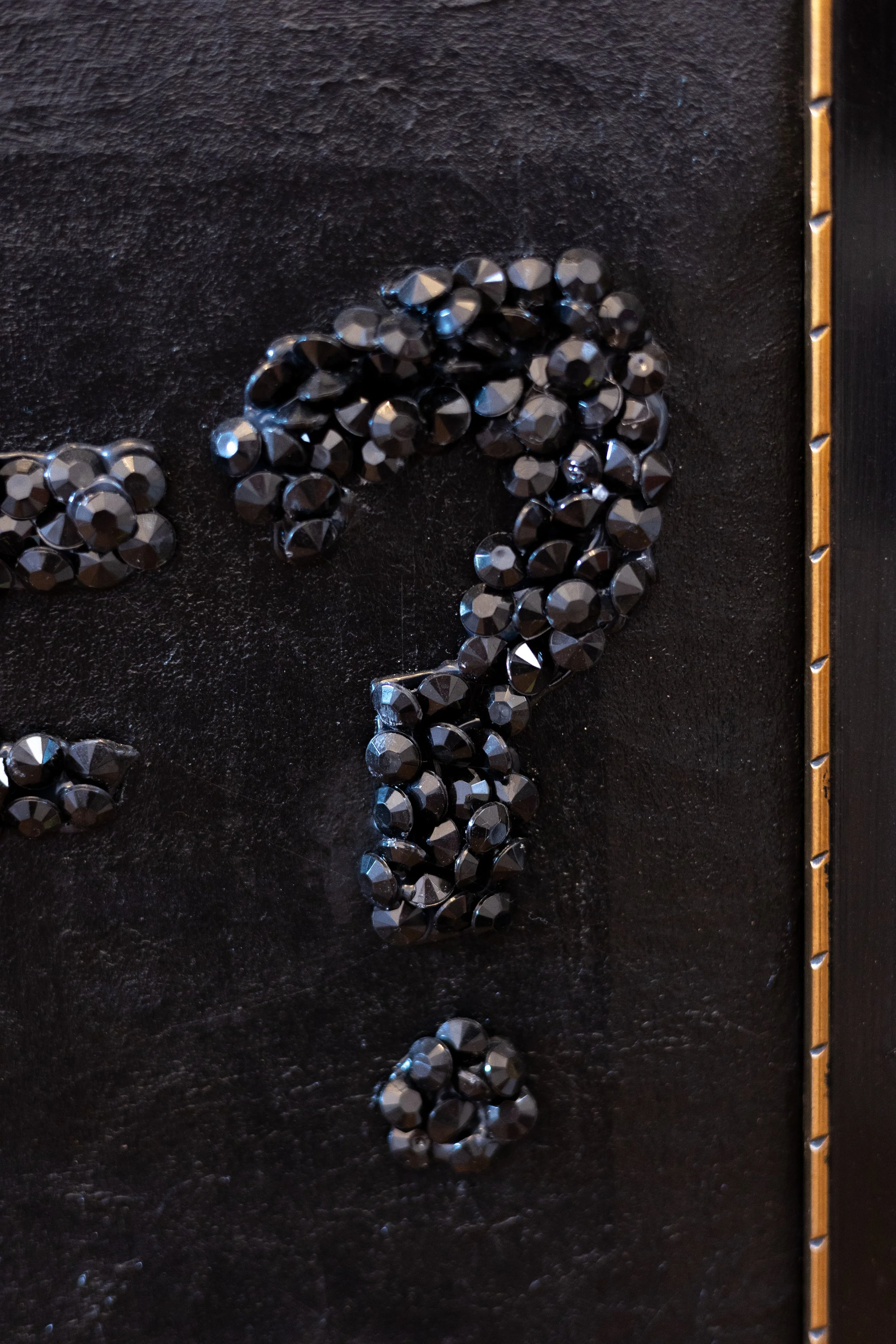 I love the way the different textures of this piece play off each other - the sparkle of the acrylic stones against the rough, bumpy vintage canvas, encircled by the hard, shiny lacquer of the frame. The points of light trick the eye, and in the end just reinforce the inky black of the void.