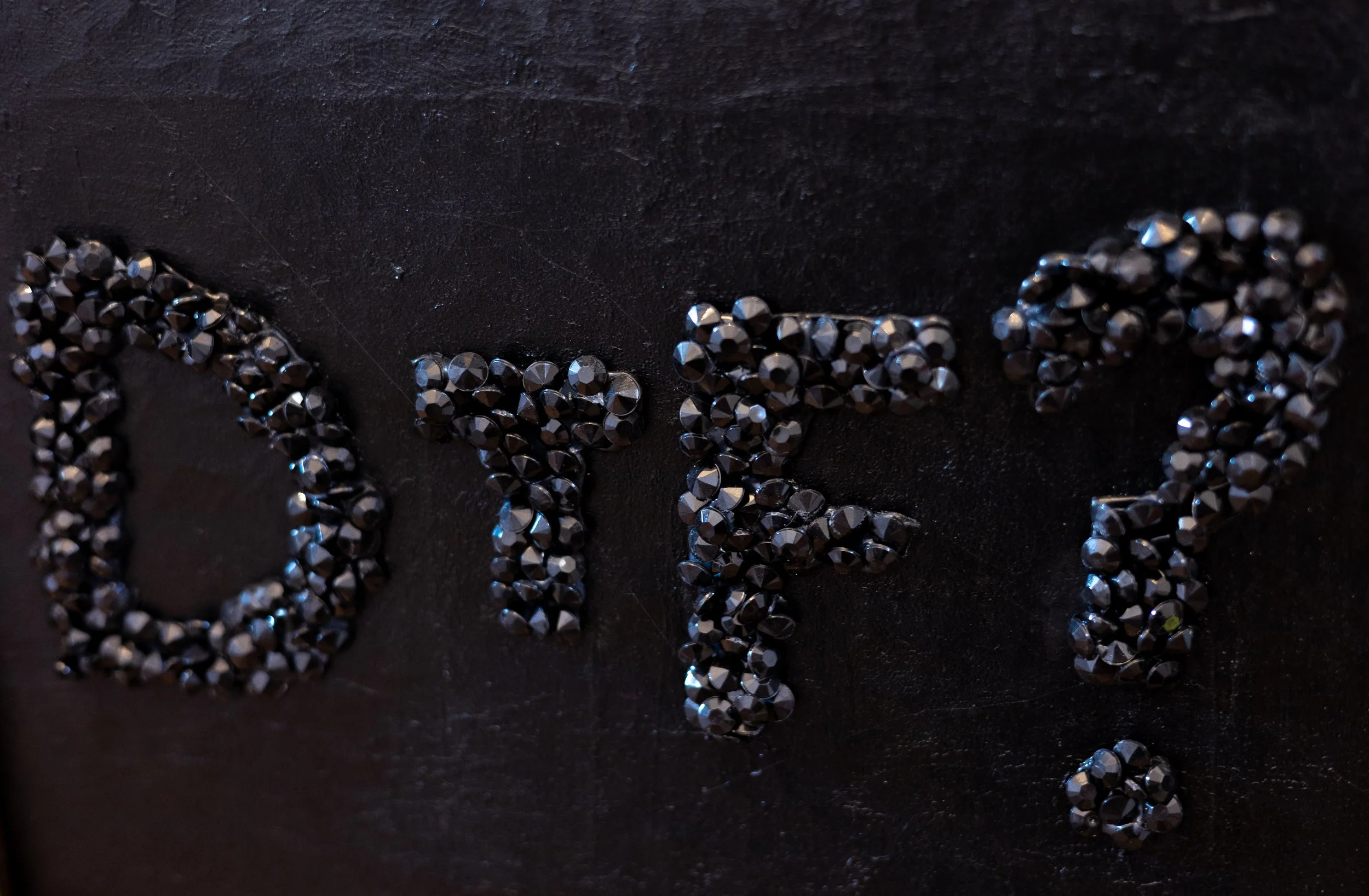 The lettering on this piece says ‘DTF?’, which, if you are blissfully unaware of modern dating parlance (you lucky thing), means ‘down to fuck?’.